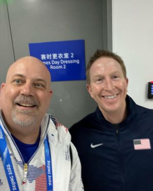 After the men competed, it was back to practice with pairs and dance team. Then back to the village for a quick bite. Bonus was getting to sit with Nathan, Mariah and Michal for dinner. After dinner, it was back to the Czech building for a few treatments and then off to the National Indoor Stadium to see China play USA in ice hockey. Cory Kane plays for China and has been a client for 8 years. I had never had the chance to see him play and this was my opportunity. Even better it was at the Olympics against the US! Cory got a lot of playing time and the game was exciting even though China lost. On the way out, I was directed through the locker room hallway and ran into Chris Mizer. Chris is the Athletic Trainer for USA Hockey and was our minor league AT when I was with the Mighty Ducks. A couple of quick hello’s and a picture before he had to get back to the room for the 3rd period.